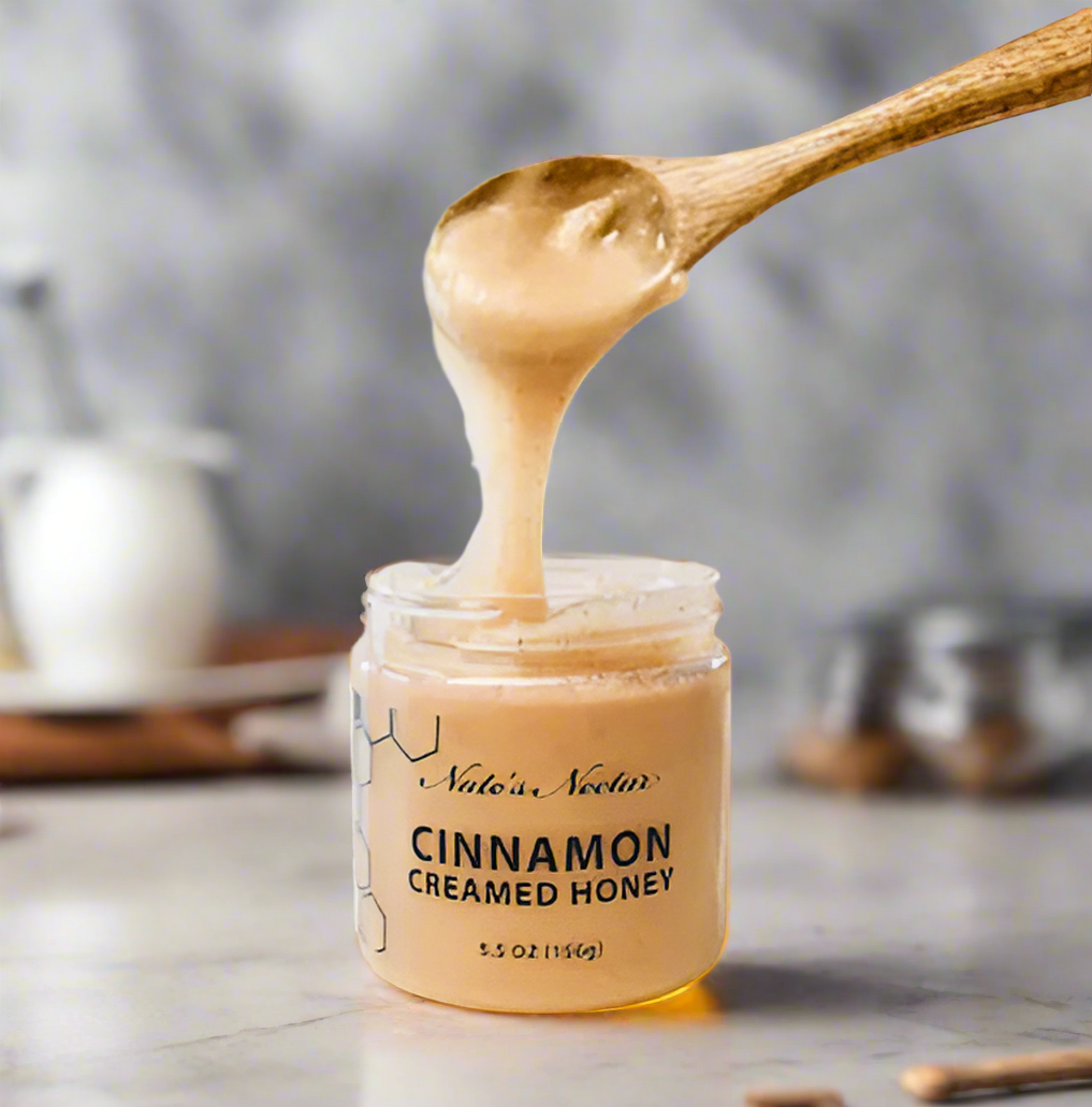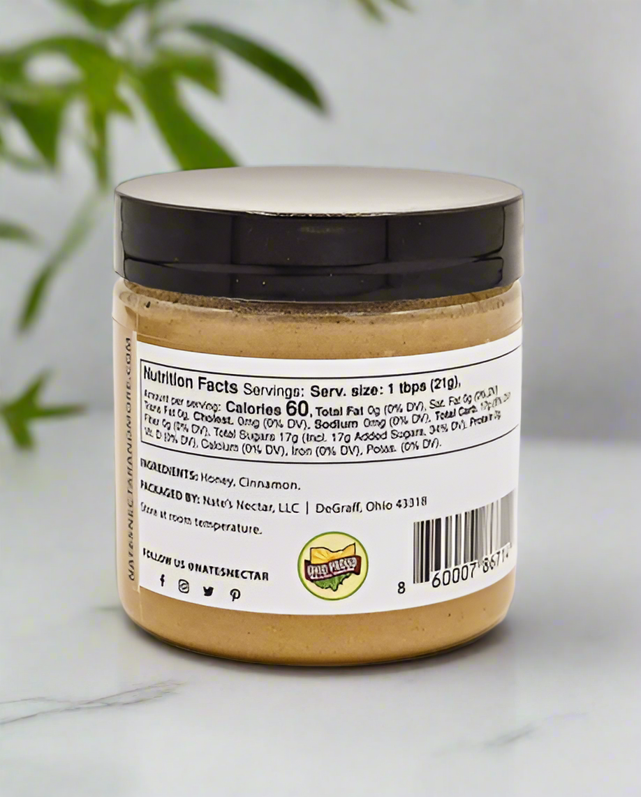 Handmade in Ohio, USA.  Cinnamon Creamed Honey blends smooth, spreadable honey with the warm, comforting taste of cinnamon. Each 5.5 oz jar is crafted in small batches to guarantee freshness and rich flavor. Creamed honey is stored at room temperature and has a two-year shelf-life.