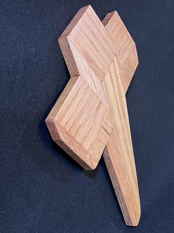 Each of the nine oak segments contributes to a grid-like structure within the cross, with the seams subtly visible to highlight its modular construction rather than hide it.