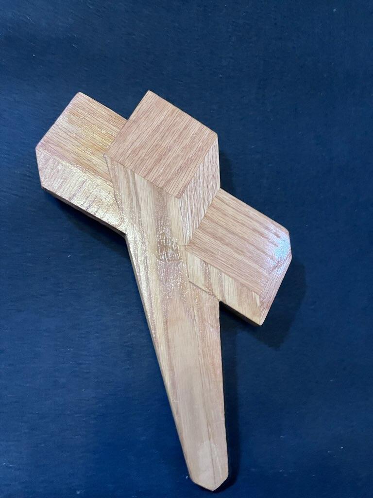 This handcrafted, handcrafted in the USA, cross measures 9 inches wide X 13 inches tall, constructed from sold oak wood, renowned for its strength and durability and striking grain patterns. What makes this cross truly unique is its composition of nine separate pieces, each carefully cut and joined to form a unified cross shape. the design is both artistic and symbolic, embodying unity through diversity.