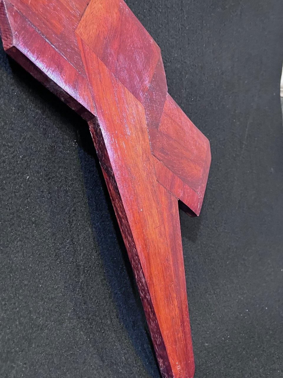 Handcrafted in the USA, Padauk Would a richly colored hardwood prized for its vibrant reddish orange tones that deepen over time into a luxurious deep red or mahogany brown. What makes this cross stand out is its construction from nine distinct wooden segments, meticulously cut and joined to form a unified yet visually dynamic cross. Each piece contributes to the whole while retaining its Individuality through intentional grain orientation.