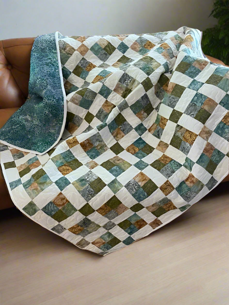 Boutique style quilt in blue, aqua, beige and gold 55” X 55”. This Beautiful handmade quilt features a boutique inspired design set against a crisp white background, offering stunning contrast and visual texture. The quilt, handmade in the USA, is composed of a tile grid layout and alternates between patch blocks and single motif blocks, creating an eye-catching and balanced aesthetic.