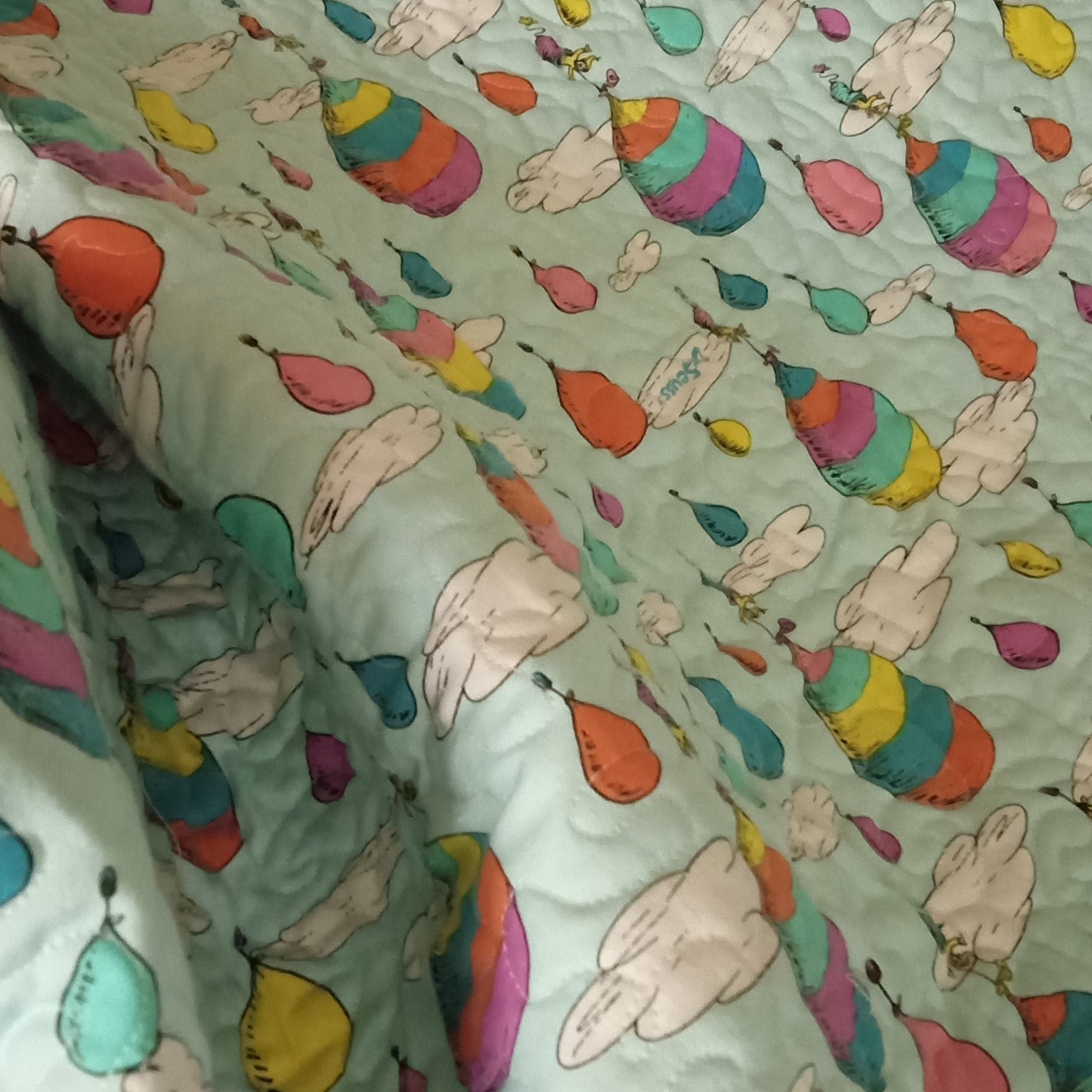 Crafted with care, this piece features an iconic 100% cotton balloon print on the front, a pure white cotton flannel back, and a soft layer of 20% polyester batting for light warmth and lasting comfort. The swirly, meandering quilting pattern adds texture and charm while keeping the layers perfectly snug.