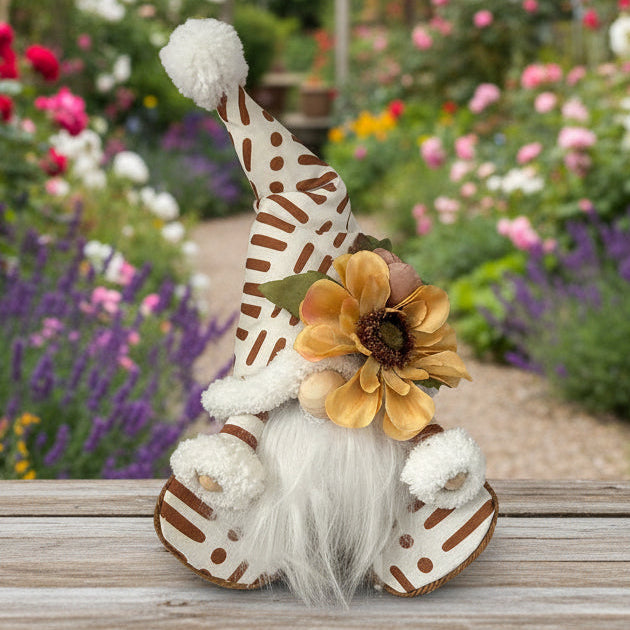 Standing 10 inches tall and 6 inches wide, this charming handcrafted gnome features a soft white beard, cozy plush details, and a warm neutral color palette. The tall fabric hat is accented with a beautiful golden flower, adding a touch of floral elegance and rustic charm. Patterned shoes and cuffed hands give this piece extra personality and texture. Perfect for shelf styling, tiered trays, mantels, or seasonal décor, this gnome brings a cozy, farmhouse-inspired feel to any space.
