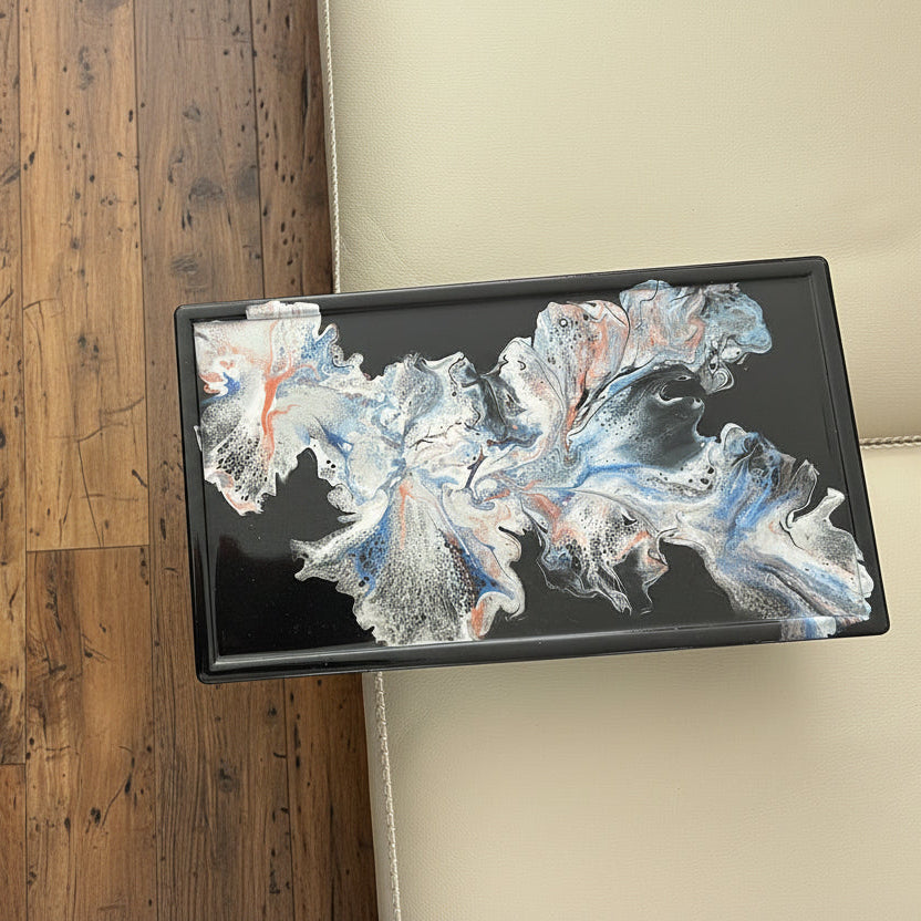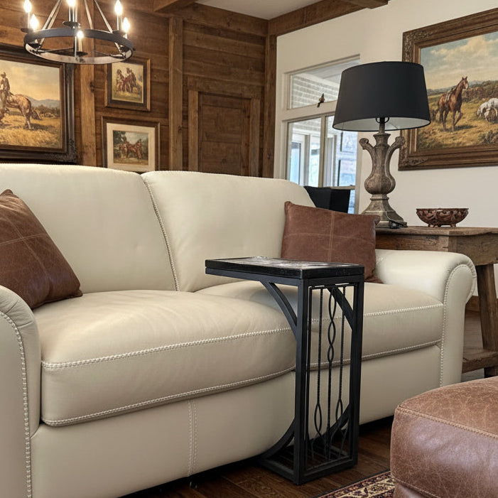 This slide-under couch table is both functional furniture and original artwork. Designed to tuck neatly under a sofa or chair, it works beautifully as a side table for drinks, books, or décor while keeping everything within easy reach.